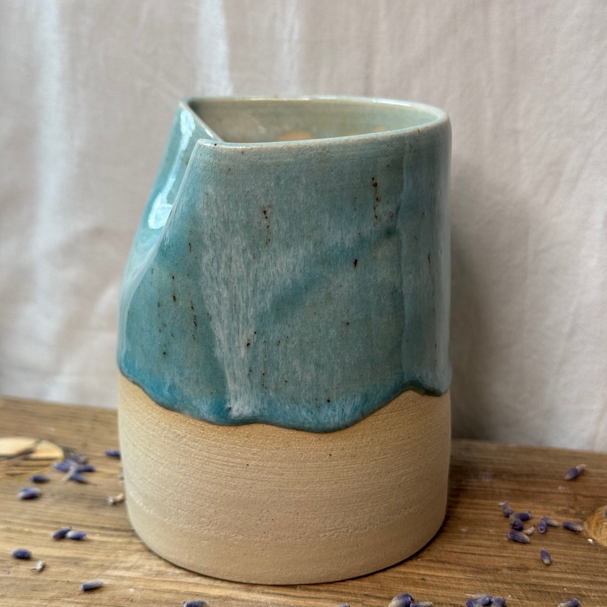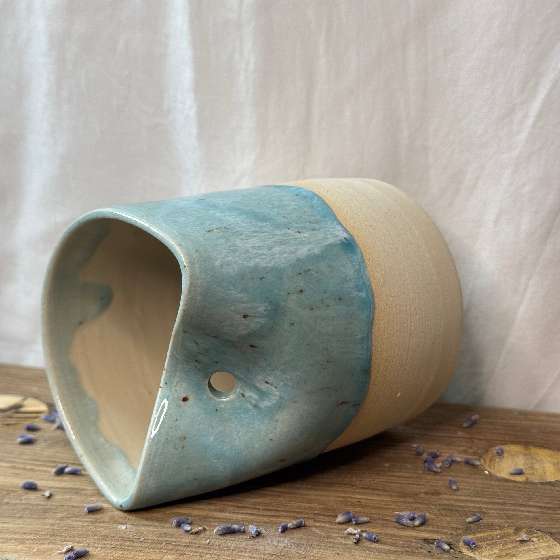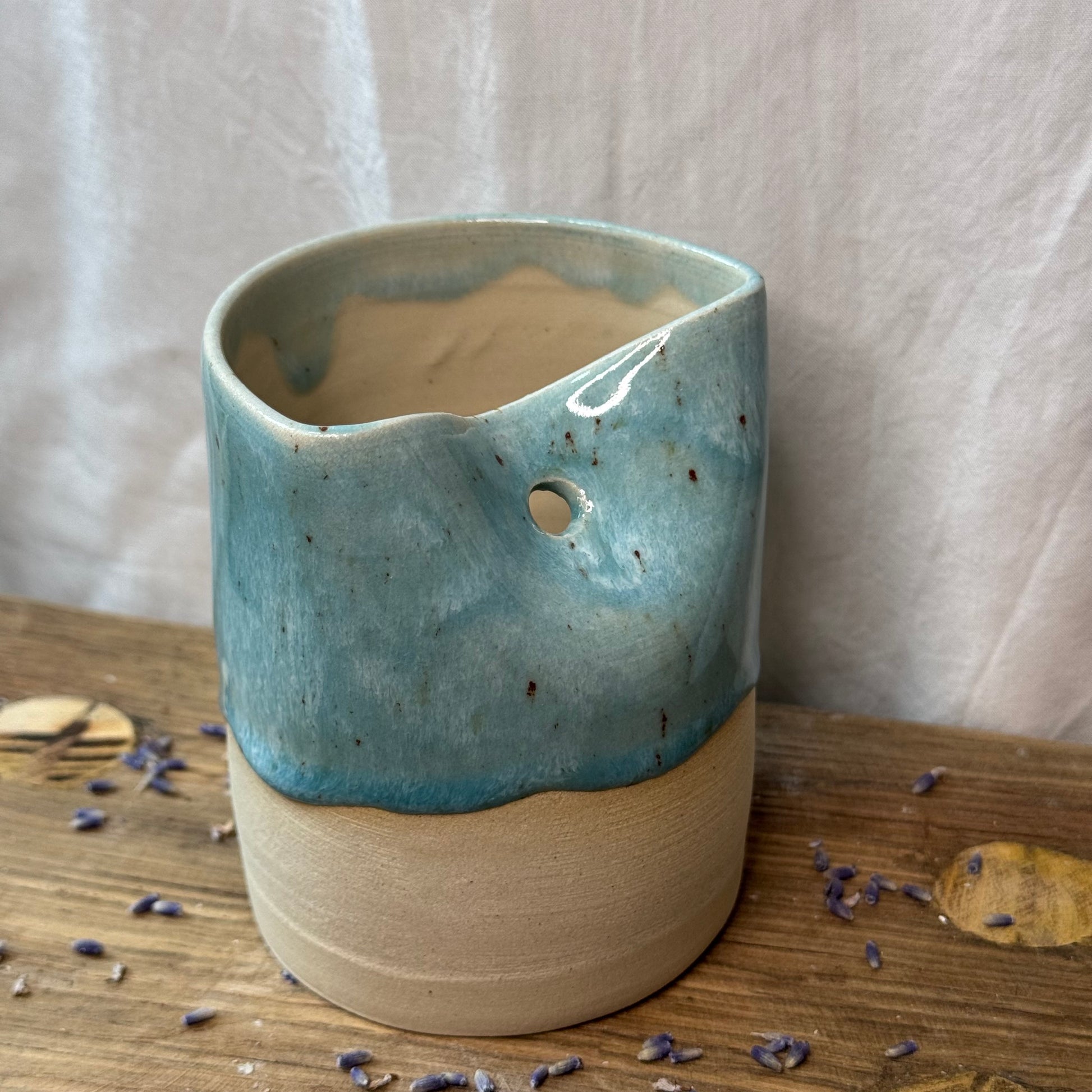 Handgetöpferter Keramikbecher aus hellem Steinzeugton mit Strohalm Aussparung