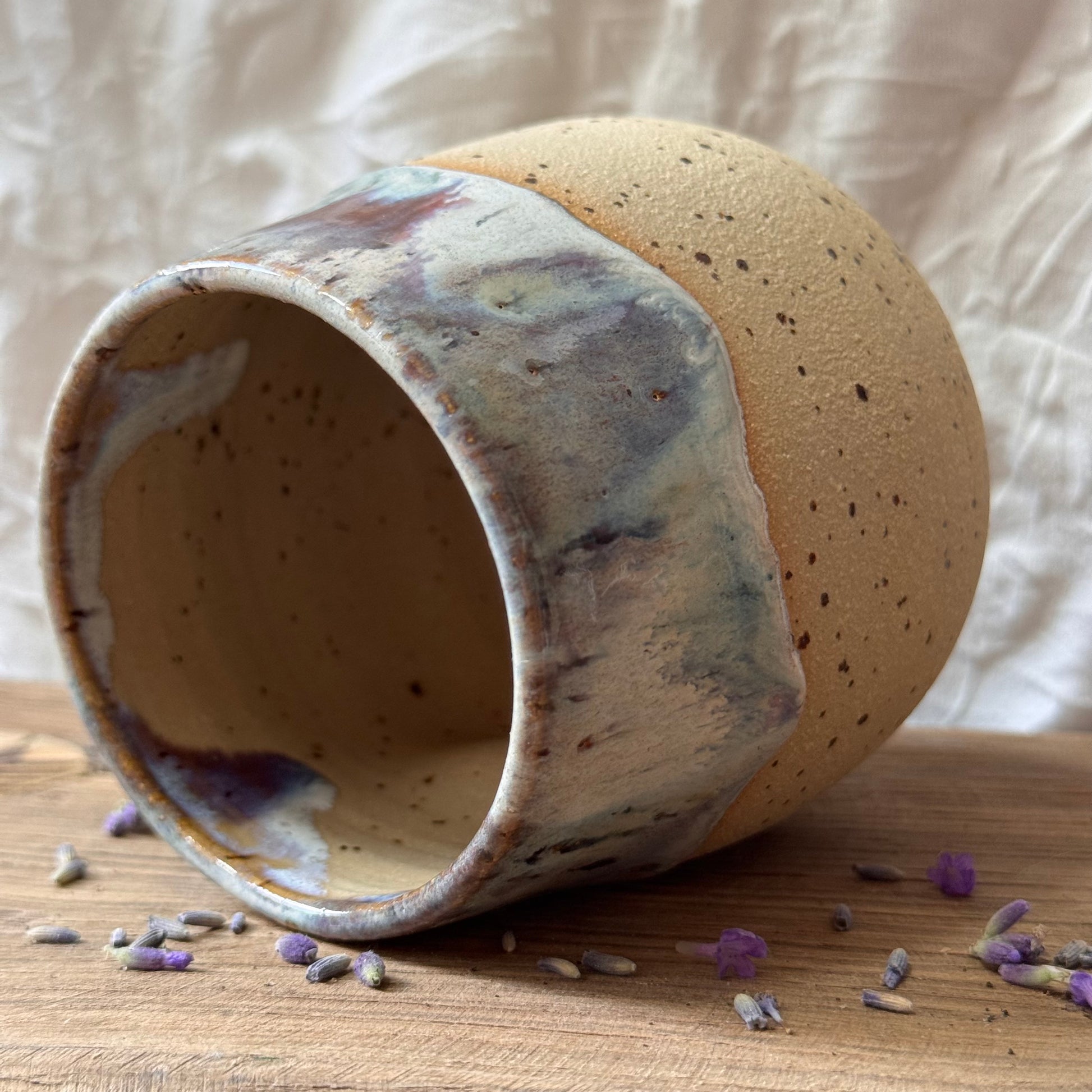 Handgetöpferter Keramikbecher mit Daumenmulde aus hellem Pünktchen Steinzeugton.